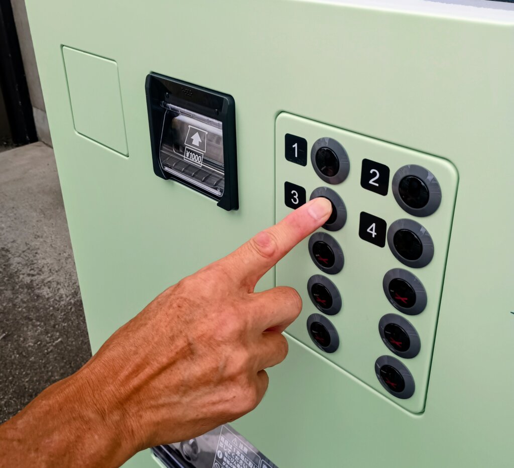 購入方法:お支払いは現金のみとなります。操作は①お金を入れてから、②メニューに記載の番号と同じボタンを押すだけです。