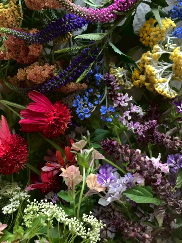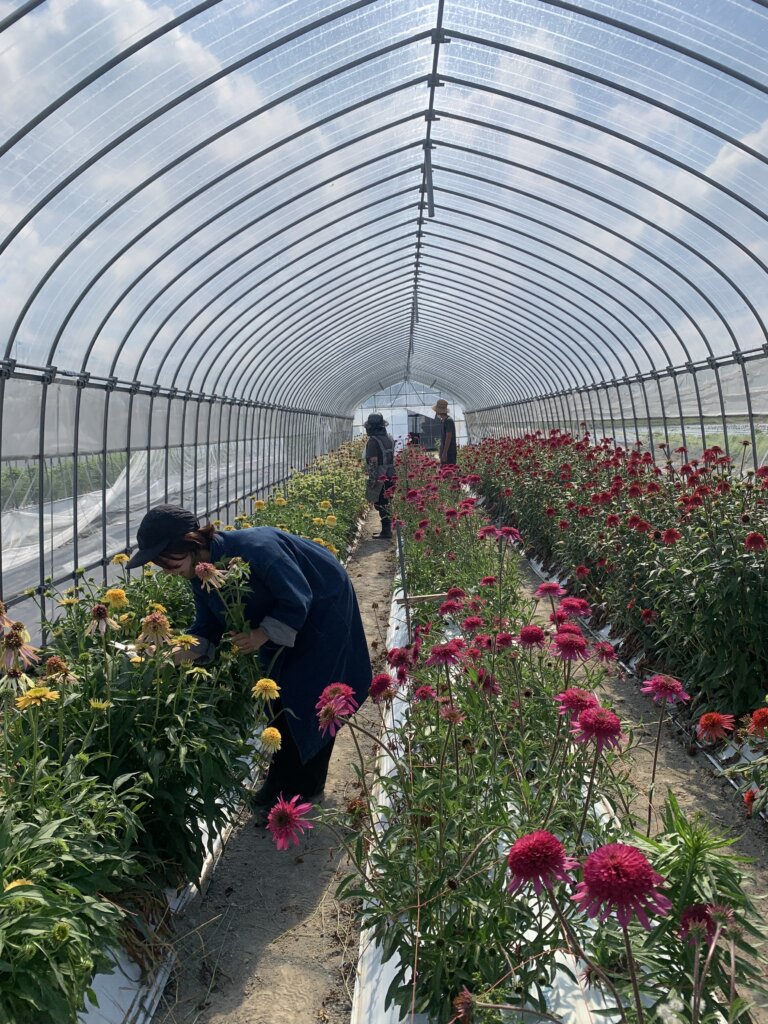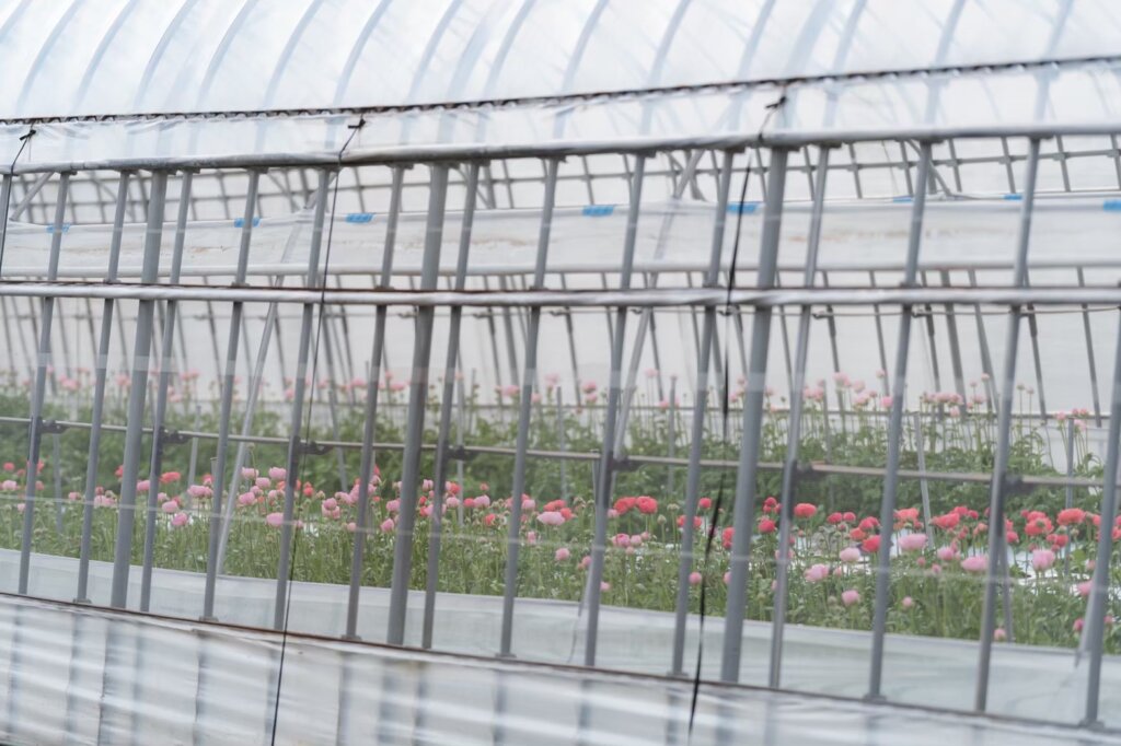 季節ごとに畑を訪ねると、初夏にはのびのびと枝葉を伸ばすグリーンに、鮮やかな花々。秋口になると、夏の勢いが落ち着き、冬が近くなるとまるで一面雪のようなシラスやダスティミラー。ハウスでは色とりどりのパンジーやラナンキュラス。そして春先、淡い色合いの草花に移り変わっていきます。