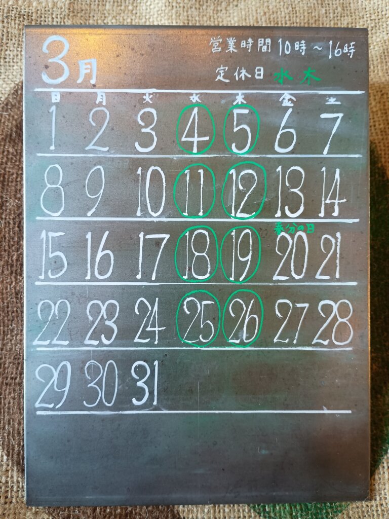 3月のお休みは今まで通り、毎週水曜と木曜でございます。